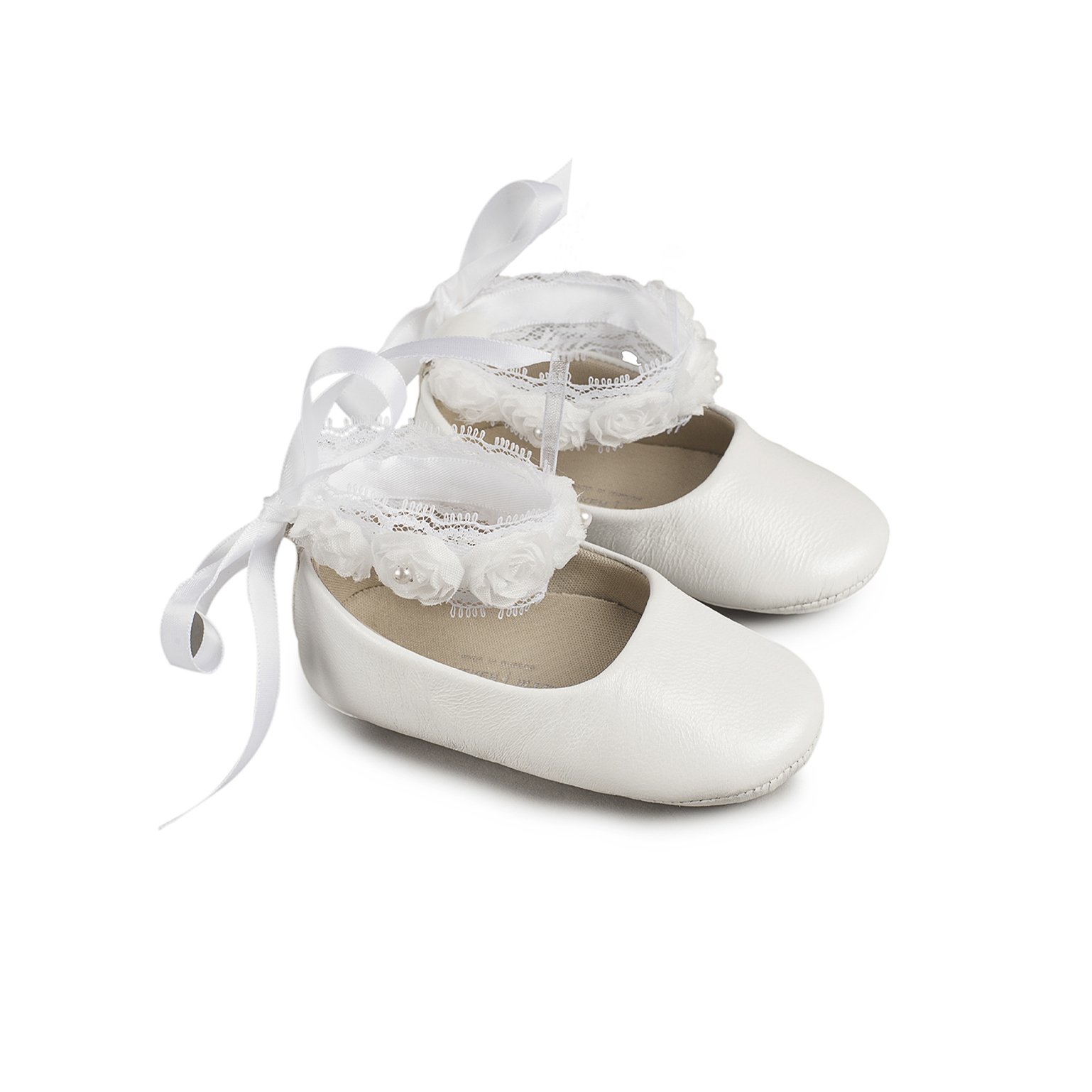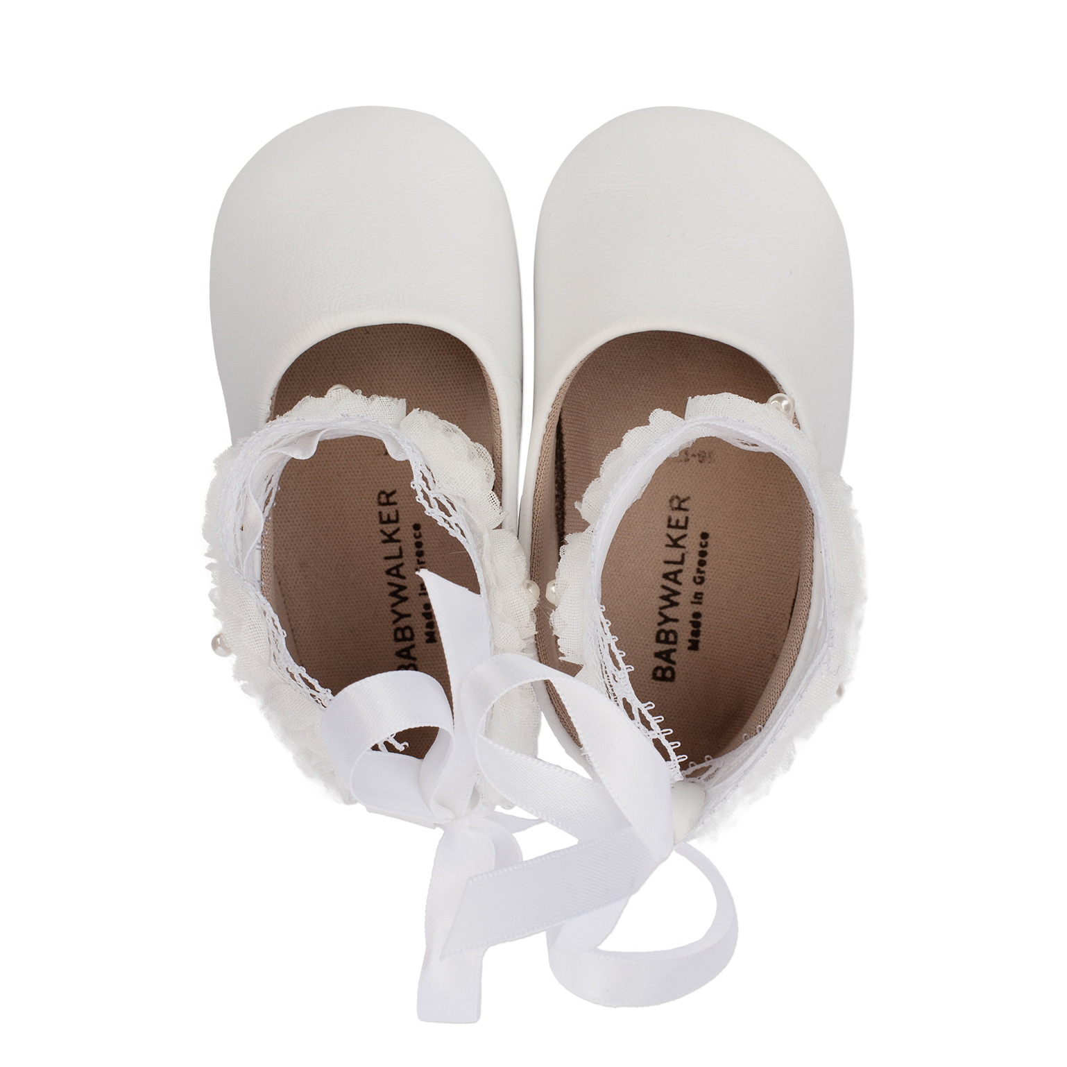 Δερμάτινη Mπαλαρίνα με Δέσιμο στον Αστράγαλο από Chiffon Λουλούδια από Δέρμα Πέρλα σε Λευκό Χρώμα Babywalker