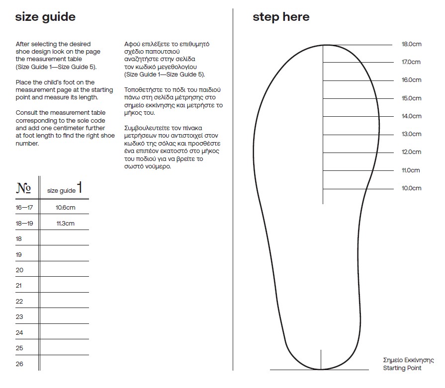 -Για να βρείτε το σωστό νούμερο, στο μήκος του ποδιού θα πρέπει να προσθέσετε επιπλέον 1 εκατοστό ( απαραίτητο άνοιγμα για ευρυχωρία και μελλοντική ανάπτυξη)