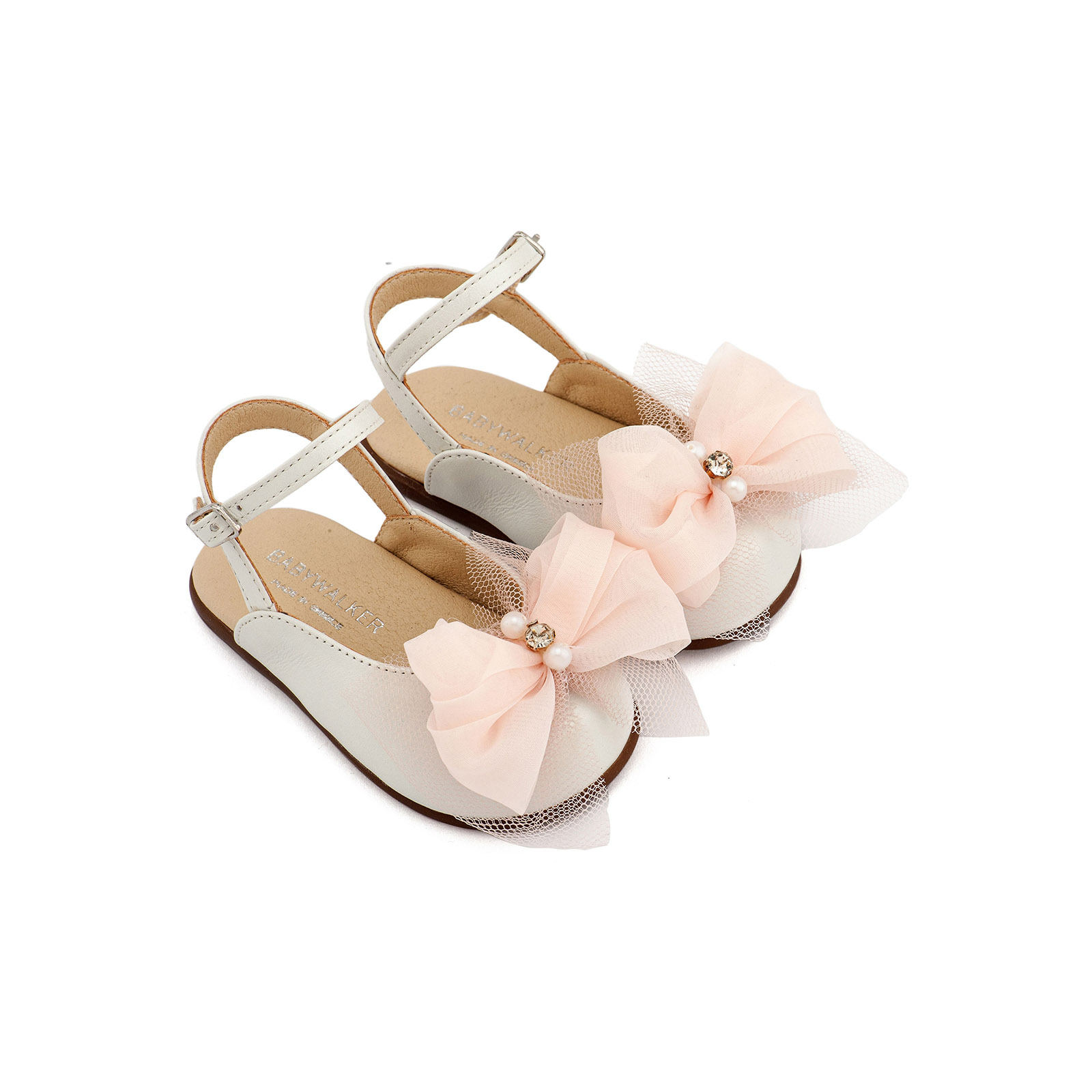 Δερμάτινο Γαλλικό Σαμπό, Διακοσμημένο με Φιόγκο Οργάντζας και Στρας σε Εκρού Ροζ Χρώμα της εταιρείας Babywalker.