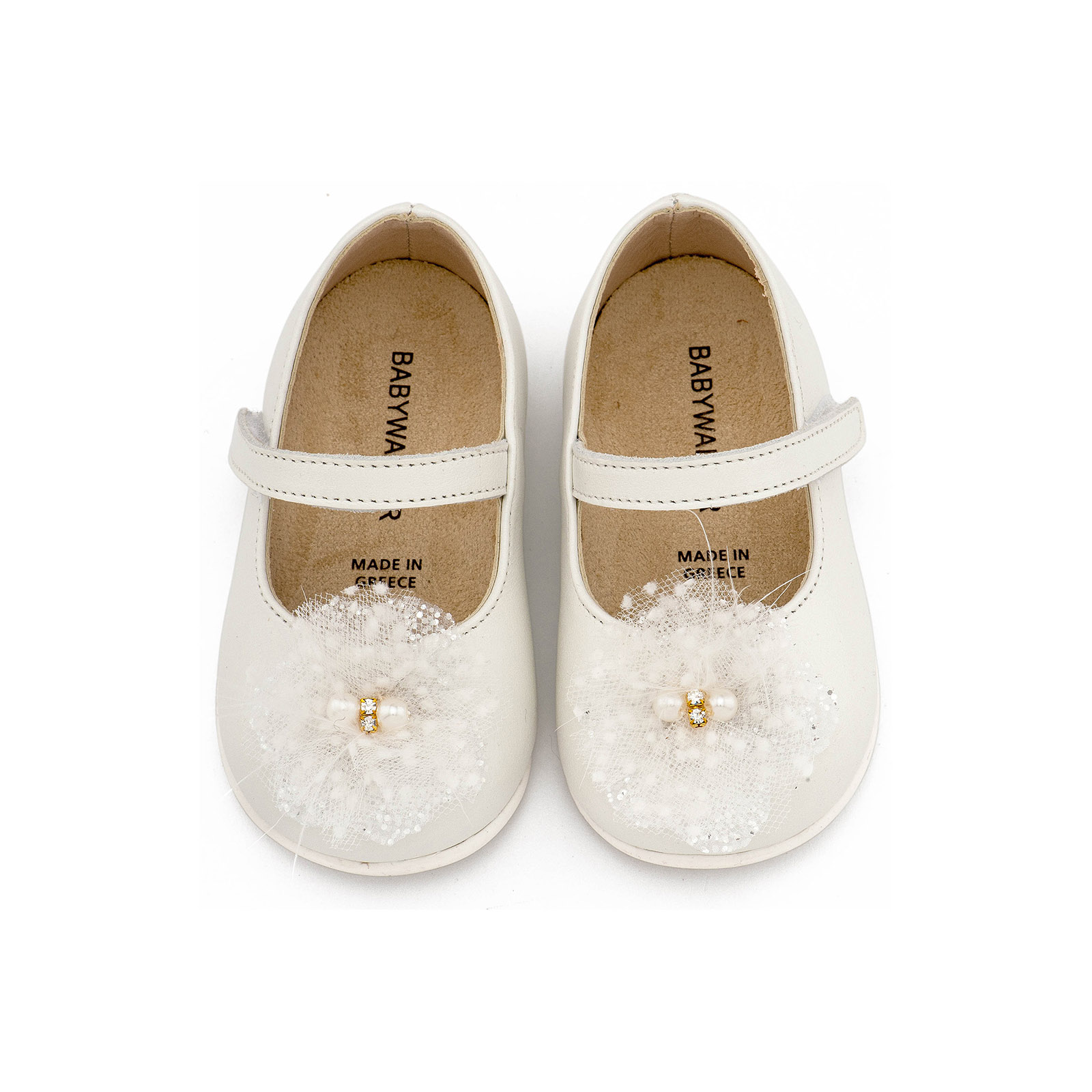 Δερμάτινο Γοβάκι με Μονή Μπαρέτα και Χειροποίητο Διακοσμητικό απο Τούλι, σε Εκρού Χρώμα της εταιρείας Babywalker.