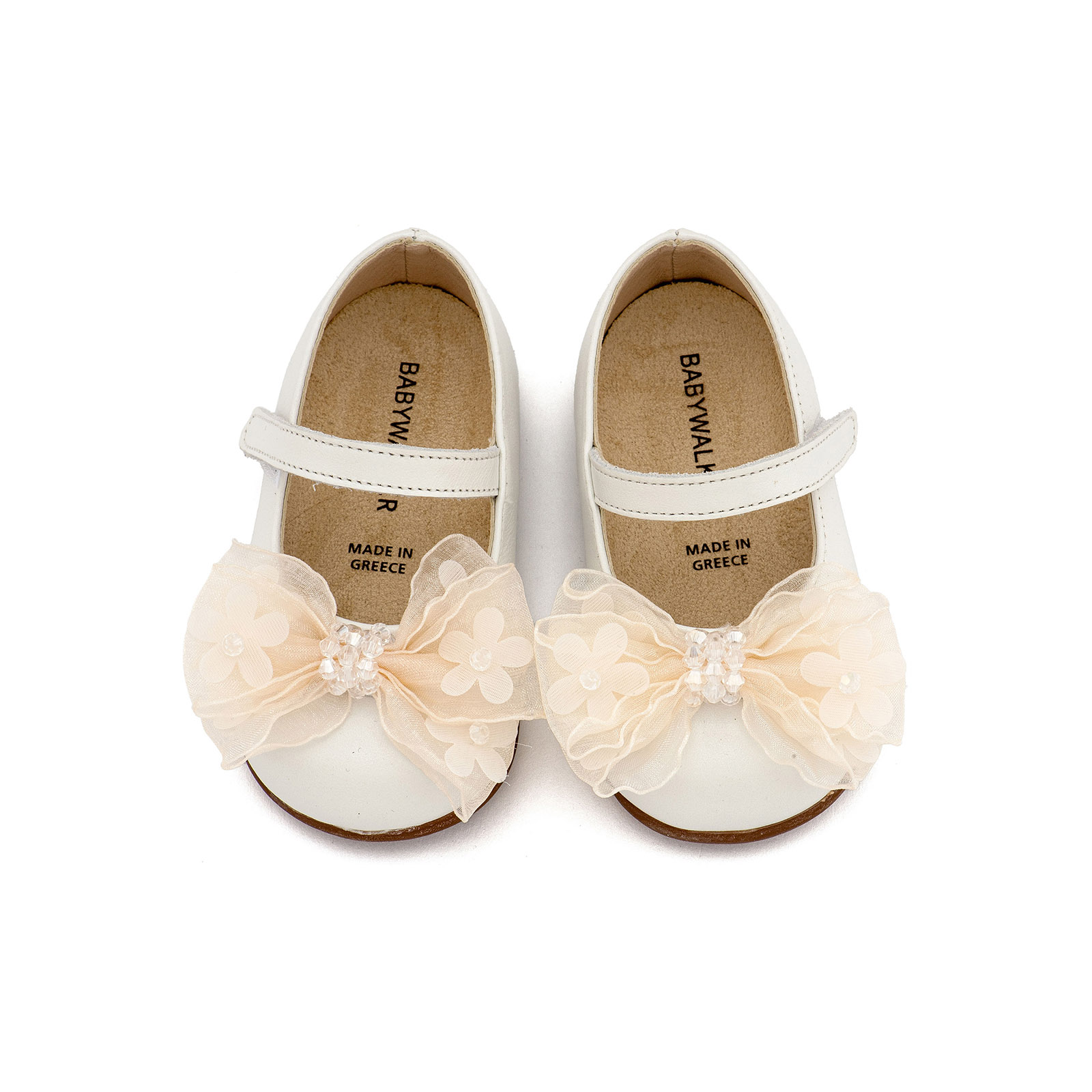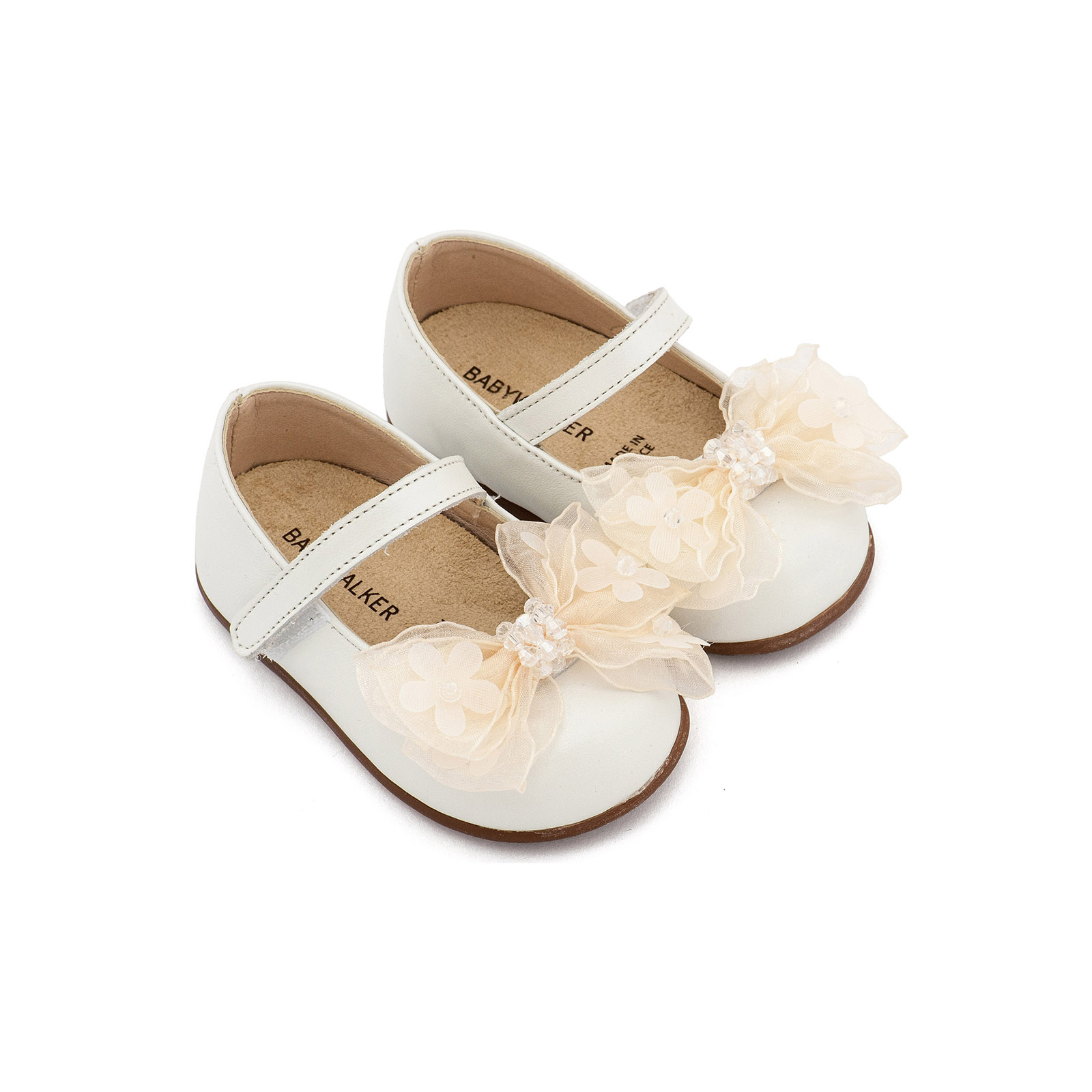 Δερμάτινο Γοβάκι με Μονή Μπαρέτα και Φιογκάκι Οργάντζας σε Εκρού Χρώμα της εταιρείας Babywalker.