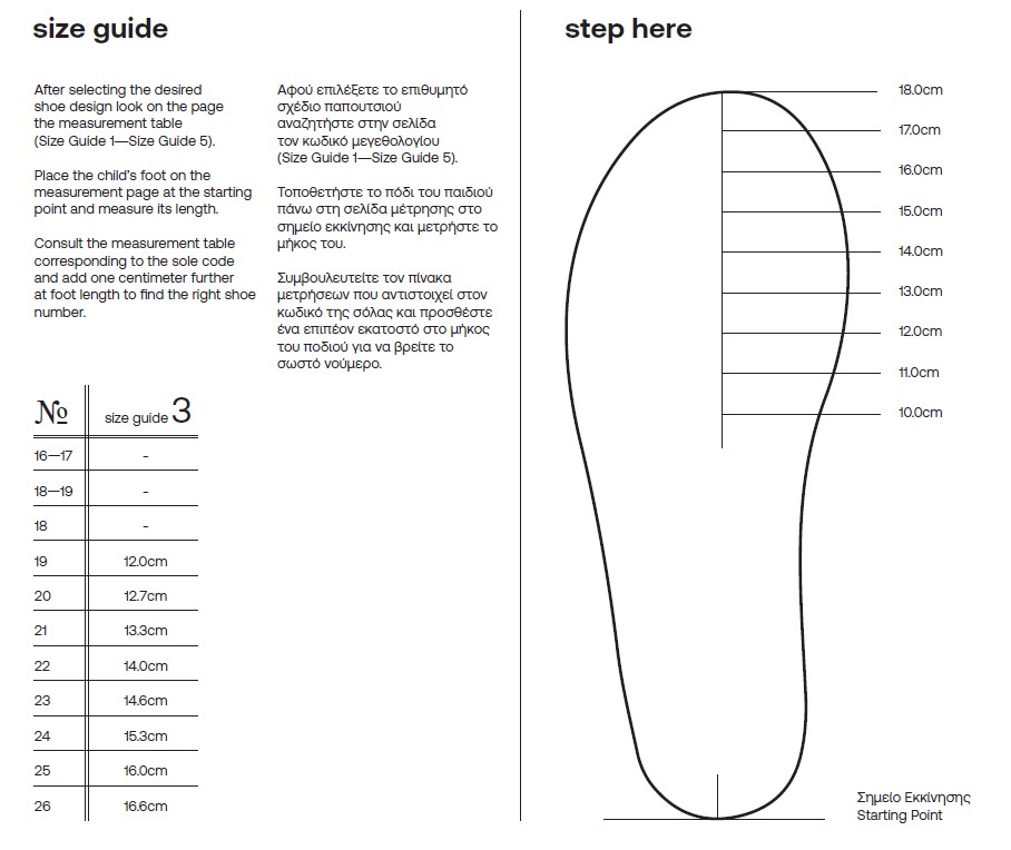 -Για να βρείτε το σωστό νούμερο, στο μήκος του ποδιού θα πρέπει να προσθέσετε επιπλέον 1 εκατοστό ( απαραίτητο άνοιγμα για ευρυχωρία και μελλοντική ανάπτυξη)