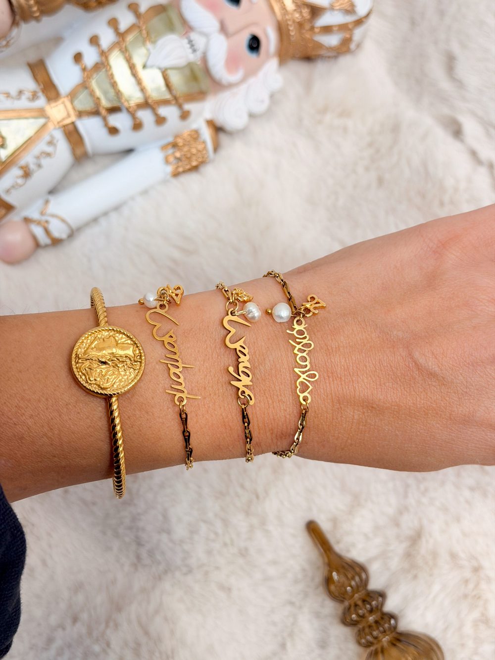 Βραχιολάκι με ατσάλινη επιγραφή μαμά, νονά,γιαγιά με μαργαριτάρι.