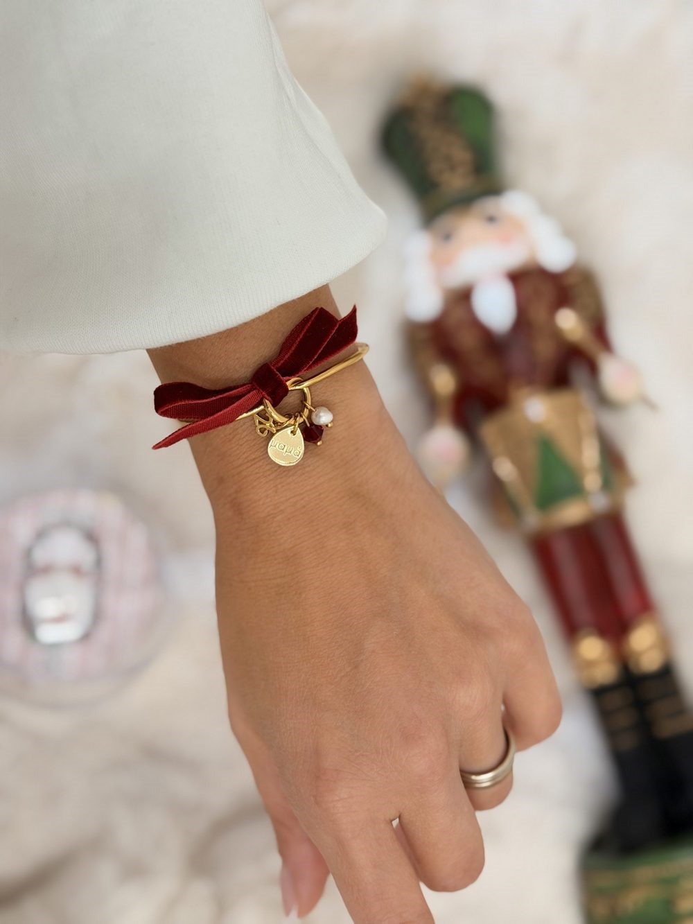 Μπρασελέ επιχρυσωμένο με μπορντώ βελούδινο φιογκάκι,μοτιφ 26,μαργαριτάρι,κρυσταλλάκι σε μαμά και σε νονά.Το μοτιφ της γιαγιάς είναι χρυσή πλέξιγκλας καρδιά πιο στρογγυλεμένη.