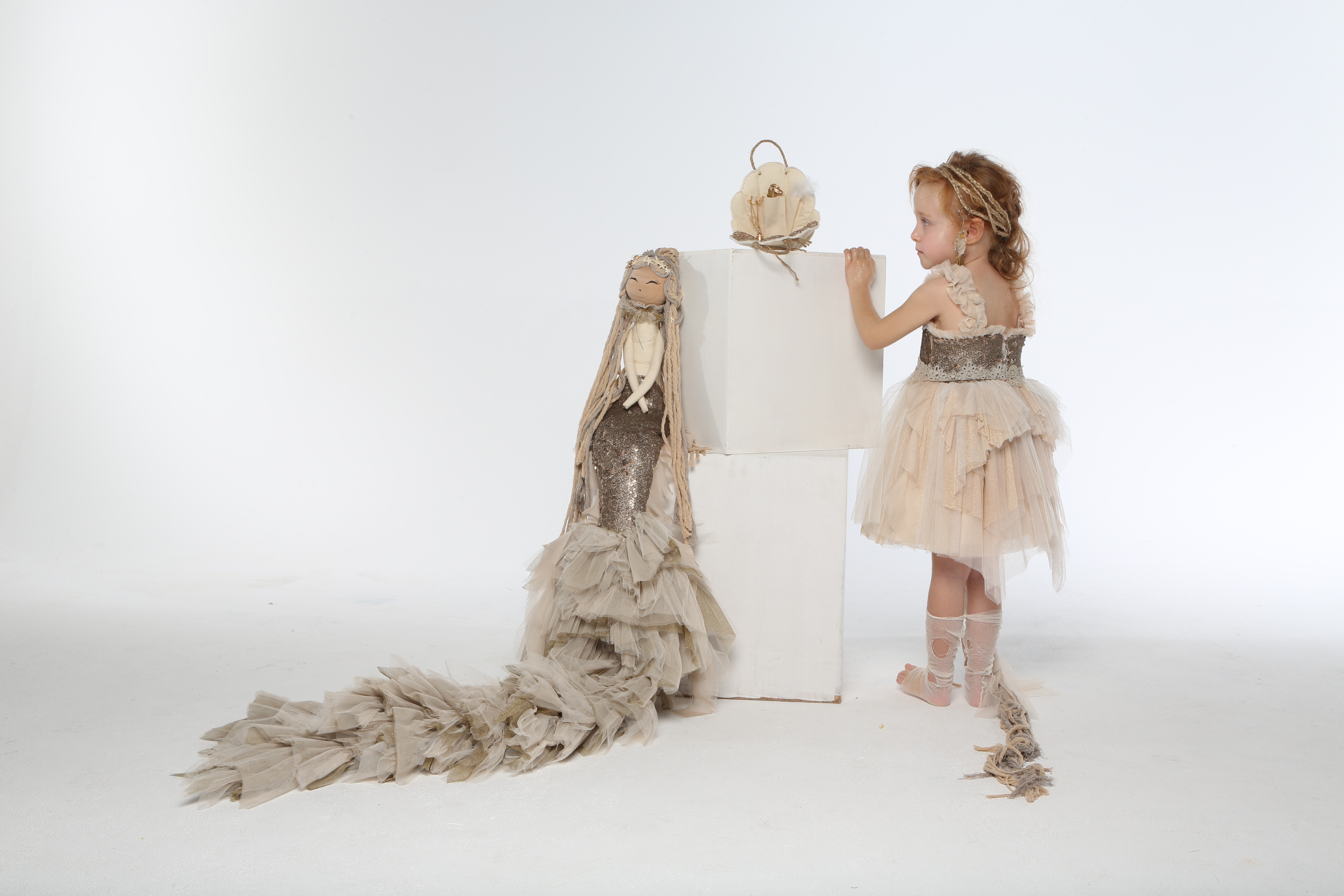 Η κούκλα-γοργόνα, ντυμένη με στρώσεις από τούλι σε γήινες αποχρώσεις, αστράφτει με λεπτομέρειες από παγιέτες που θυμίζουν φως που αντανακλάται στο νερό. Η μακριά της ουρά κυλά απαλά στο πάτωμα σαν κύμα, ενώ τα μαλλιά της πέφτουν ελεύθερα, σαν φύκια που χορεύουν στη θάλασσα.