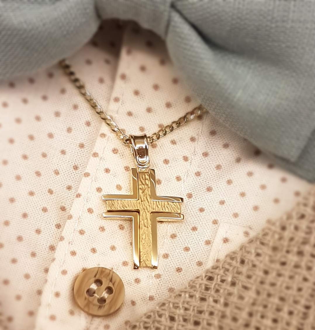 Ένας χεροποίητος αντρικός σταυρός σε συνδυασμό με μια αλυσίδα κορδόνι πλεγμένη περίτεχνα με πολλαπλούς κρίκους δίνουν την ισορροπία ανάμεσα στο σύγχρονο και το διαχρονικό σχεδιασμό καθώς ο σταυρός της βάπτισης θα συντροφεύει το αγοράκι για πολλά χρόνια.Τέλος, οι αλυσίδες καλό θα ήταν να μην υπερβάλουν σε μήκος καθώς πρόκειται για μικρά παιδάκια. Ένα ακόμα σημαντικό στοιχείο πριν την τελική επιλογή του σταυρού βάπτισης είναι τα καράτια του χρυσού14 ή 18 καρατίων. Σταυροί με πολύτιμες πέτρες και διαμάντια είναι στα 18 καράτια ενώ σταυροί με ζιργκόν είναι στα 14 καράτια. Ανάλογη με τα καράτια του σταυρού μπορεί να είναι και η αλυσίδα.